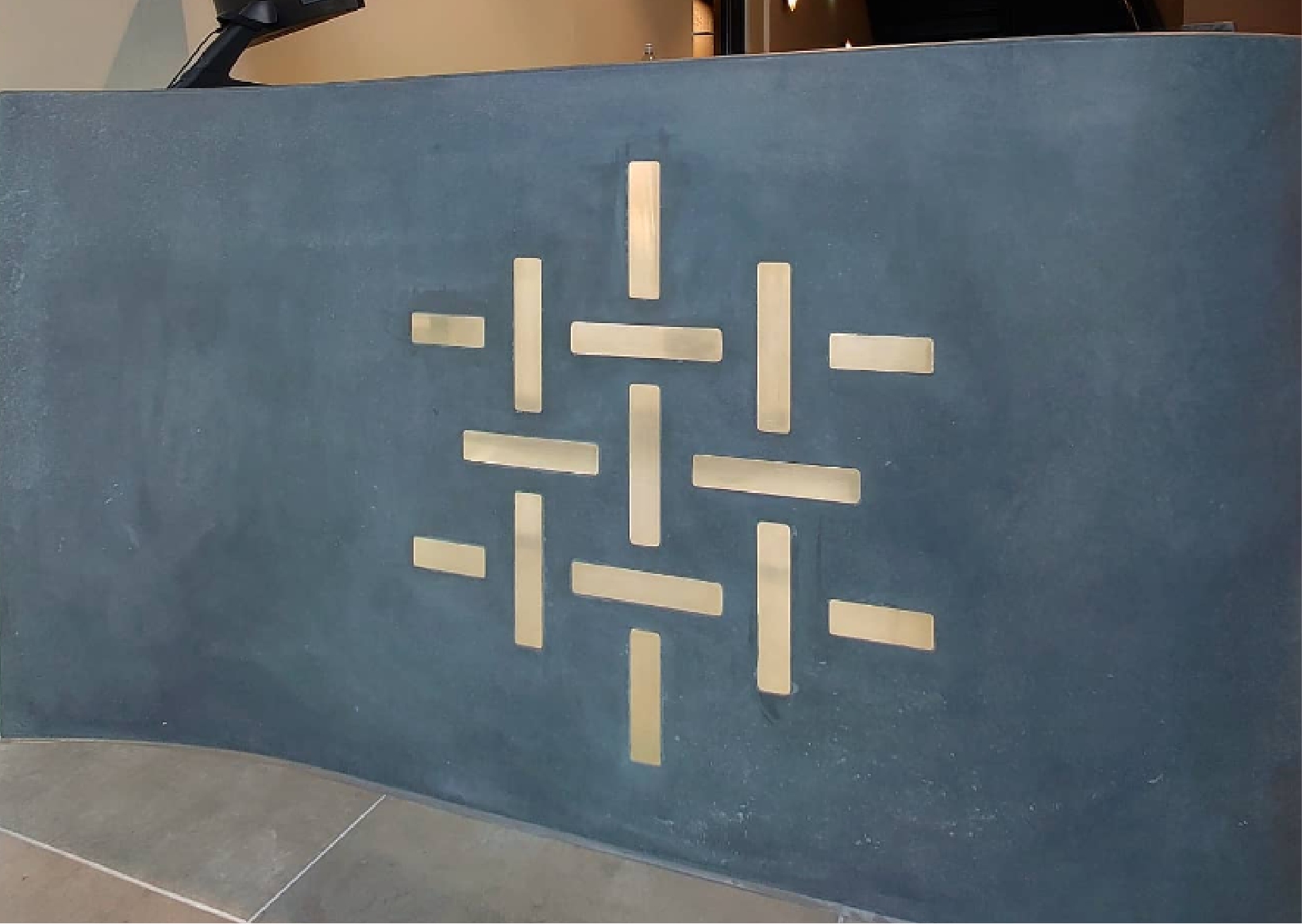 For the entrance, we made a five-metre stretch of concrete, then designed a debossing technique that delivered an impactful brand identity in 3D. Other lettering was cut on a CNC machine, given a fibreglass coating to make it impermeable and reusable, while the curved reception desk incorporated brass inlays.